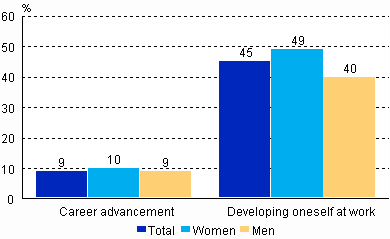 Finnish employees appreciate the contents of their work and the opportunities for development provided by their work significantly more than the career advancement possibilities linked with their work. Good social relationships, security and a long-term perspective are also very important aspects of work. Gainful employment is a rather significant part in the life of Finnish employees, and many would like to continue it in some form even after reaching retirement age.