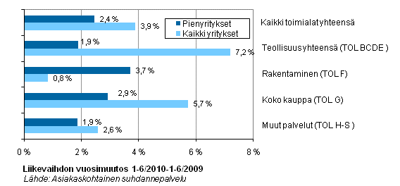Suomalaisyritysten liikevaihto oli alkuvuonna kasvussa kaikilla toimialoilla. Tammi-kesäkuussa kaikkien yritysten liikevaihto kasvoi 3,9 prosenttia ja pienyritysten liikevaihto 2,4 prosenttia vuoden takaisesta. Etenkin rakennusalalla pienyritysten kehitys oli suotuisaa: rakentamisen pienyritysten liikevaihto lisääntyi 3,7 prosenttia, kun alan kaikkien yritysten liikevaihdon kasvu jäi vajaaseen prosenttiin edellisvuoden alkupuoliskoon verrattuna.