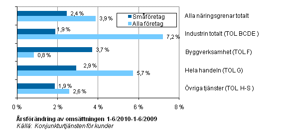 De finländska företagens omsättning ökade inom alla näringsgrenar under början av året. Under januari-juni ökade omsättningen för alla företag med 3,9 procent och omsättningen för småföretag med 2,4 procent från året innan. Utvecklingen i småföretag var gynnsam i synnerhet inom byggbranschen: omsättningen för småföretag inom byggverksamhet ökade med 3,7 procent, medan ökningen av omsättningen för alla företag inom branschen var något under en procent jämfört med första hälften av år 2009.