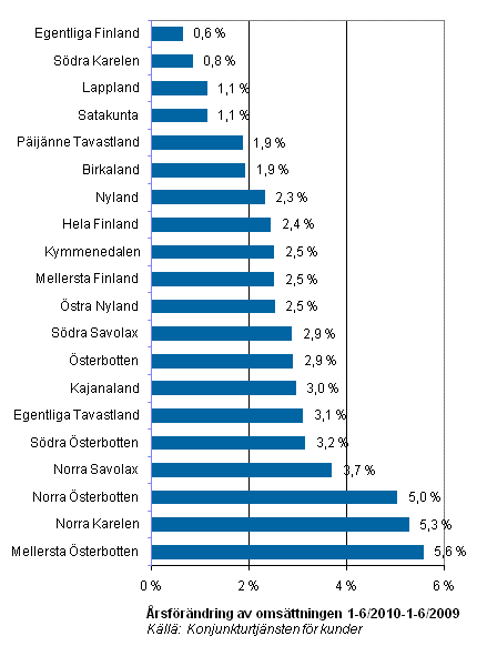 Småföretagens omsättning ökade under det första halvåret 2010 i alla landskap. De bästa tillväxtsiffrorna hade Mellersta Österbotten (5,6 %), Norra Karelen (5,3 %) och Norra Österbotten (5,0 %). Egentliga Tavastland, Södra Österbotten och Norra Savolax visade tillväxtsiffror på mer än 3 procent.