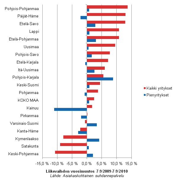 Pienten rakennusyritysten liikevaihto kehittyi tarkastelujaksolla suotuisimmin Pohjois-Karjalassa, jossa kasvua vuoden takaiseen verrattuna kertyi lähes yhdeksän prosenttia. Kymenlaaksossa yllettiin runsaan neljän prosentin kasvuun ja Varsinais-Suomessakin yli kolmen prosentin kasvuun. Kainuussa pienten rakennusyritysten liikevaihto putosi 11 prosenttia, vaikka kaikkien yritysten liikevaihto kasvoi samaan aikaan vajaat kaksi prosenttia.