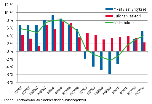 Vuoden 2009 romahdus yksityisten yritysten maksamassa palkkasummassa johtui työllisyyden heikkenemisestä. Työpaikkojen määrä laski yksityisissä yrityksissä vielä vuonna 2010, mutta lasku oli kuitenkin sen verran pientä, että ansiotason positiivinen kehitys nosti yksityisten yritysten palkkasumman kasvuun. Vuoden 2010 viimeisellä neljänneksellä työpaikkojen määrä yksityisissä yrityksissä oli jo kääntynyt kasvuun, mikä kiihdytti palkkasumman kasvua vuoden loppua kohden.