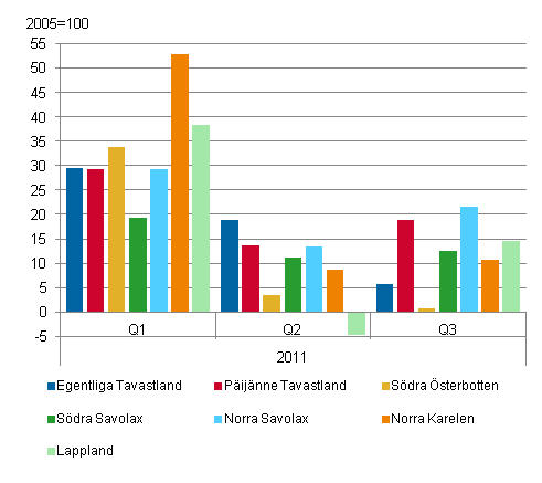 I landskapen i Fasta Finland ökade värdet av industriexporten under de tre första kvartalen år 2011 med 7,0 procent jämfört med motsvarande period 2010. En tillväxtakt på över 20 procent uppnåddes i landskapen Norra Savolax (21,5 %), Norra Karelen (21,3 %) och Päijänne-Tavastland (20,4 %). Också i Egentliga Tavastland uppvisade exportvärdet en gynnsam ökning på 17,5 procent.
