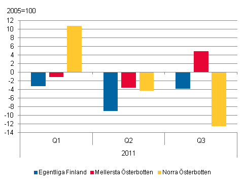 I några landskap minskade värdet av industriexporten under de tre första kvartalen 2011. I Egentliga Finland minskade exporten med 5,3 procent och i Norra Österbotten med 2,4 procent. I Mellersta Österbotten minskade exporten en aning, 0,2 procent. Industriomsättningen ökade under samma tid i Egentliga Finland med 3,2 procent, i Norra Österbotten med 2,6 procent och i Mellersta Österbotten med 6,2 procent jämfört med perioden januari-september 2010.