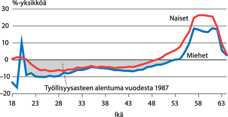 Työurien pidentämistavoitteissa ja keskusteluissa olisikin syytä ottaa huomioon, että taloudellisen huoltosuhteen kannalta kokonaistyöllisyysaste on ratkaisevassa asemassa. 30–44-vuotiaiden työllisyysasteet eivät ole vieläkään nousseet 1990-luvun lamaa edeltävälle tasolle. 30–44-vuotiaiden miesten ikäryhmittäiset työllisyysasteet olivat vuonna 2011 noin 6–8 prosenttiyksikköä alhaisemmat kuin vuonna 1987. Samanikäisten naisten kohdalla työllisyysasteet olivat vastaavasti 4–6 prosenttiyksikköä alhaisemmat.