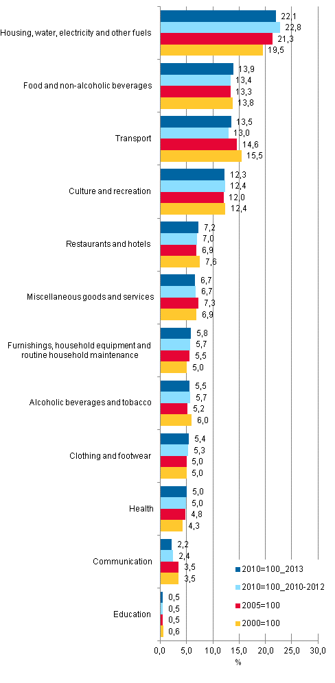 Comparison of weight structures of Consumer Price Indices 2010=100 in 2013 and in 2010-2012, 2005=100 and 2000=100, per cent.