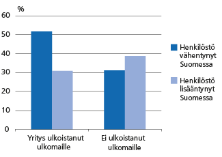 Tilanne oli päinvastainen niillä yrityksillä, jotka eivät olleet ulkoistaneet toimintojaan ulkomaille vuosina 2009–2011. Näistä lähes 40 prosenttia ilmoitti lisänneensä henkilöstöään Suomessa, kun vastaavasti vajaa kolmannes oli sitä vähentänyt.
