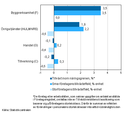Byggföretagens omsättning ökade under april–juni med 3,5 procent, medan omsättningen inom näringsgrenen ett år tidigare minskade med 1,8 procent. Enligt Tillväxtöversikten (på finska), som granskar bakgrunden till utvecklingen, var tillväxten av omsättningen inom byggverksamhet helt beroende av små företag som sysselsätter färre än 50 personer. Omsättningen för stora byggföretag som sysselsätter fler än 250 personer och medelstora som sysselsätter 50–250 personer var på samma nivå som året innan.