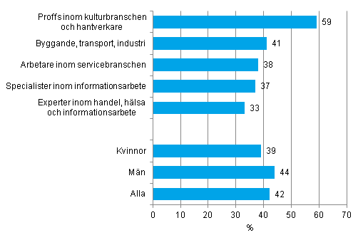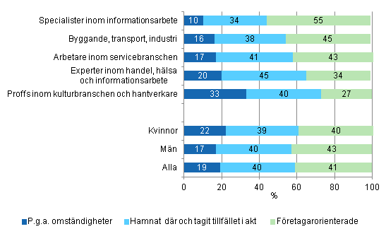 Det finns betydande skillnader mellan yrkesgrupperna när man jämför hur de blivit företagare. Var tredje självsysselsatt inom kultur- och hantverksyrken har blivit företagare på grund av omständigheterna, medan bara var tionde av specialisterna inom informationsarbete har en sådan bakgrund. Uppgifterna framgår av Statistikcentralens undersökning Självsysselsättning 2013.