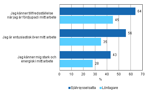 Självsysselsatta personer har ett starkt arbetsengagemang. Över hälften uppger att de är entusiastiska över sitt arbete, medan andelen bland löntagarna är drygt en tredjedel. Av alla personer som sysselsätter sig själva upplever 43 procent sig som starka och energiska i sitt arbete, motsvarande andel bland löntagarna är 28 procent.