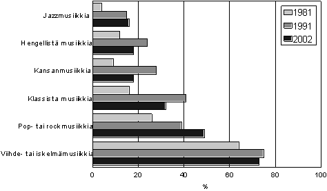 Eniten kuunnellaan pop- ja rockmusiikkia sekä viihde- ja iskelmämusiikkia. Näitä musiikkilajeja myös soitetaan eniten. Klassisen musiikin kuuntelijoista enemmistö on korkeasti koulutettuja ja 55 vuotta täyttäneitä. Naiset sekä soittavat että kuuntelevat klassista musiikkia enemmän kuin miehet.