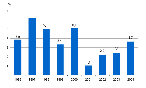Bruttokansantuotteen volyymin muutokset 1996-2004, %