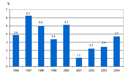 Volume changes of GDP 1996-2004, %