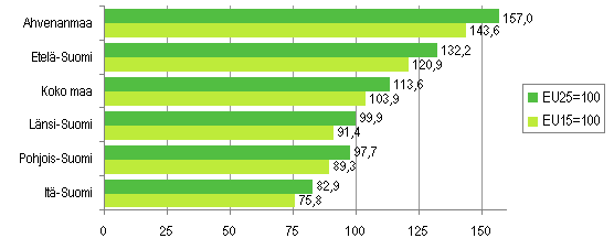Maakuntien ja seutukuntien tuotantoerot ovat kaventuneet vuoden 2003 aikana. Erot kahden kärkimaakunnan ja muiden maakuntien välillä ovat kuitenkin edelleen suuria. Uudenmaan ja Ahvenanmaan maakunta ovat ainoat maan keskiarvon ylittäjät tarkasteltaessa tuotantoa asukasta kohden. Uudellamaalla tuotanto asukasta kohti on 32 800 euroa ja Ahvenanmaalla 32 720 euroa, kun vastaava luku koko maassa on 23 780 euroa ja Kainuussa 16 270 euroa. Uudellamaalla kasvu on jäänyt kahtena vuotena hyvin matalaksi. Hieman koko maan tason alapuolella ovat Varsinais-Suomi ja Pirkanmaa. Tuotanto on viime vuosina polkenut eniten paikallaan Etelä-Karjalassa, missä se on kolmessa vuodessa pudonnut 9 prosenttia koko maan tuotantoon verrattuna.