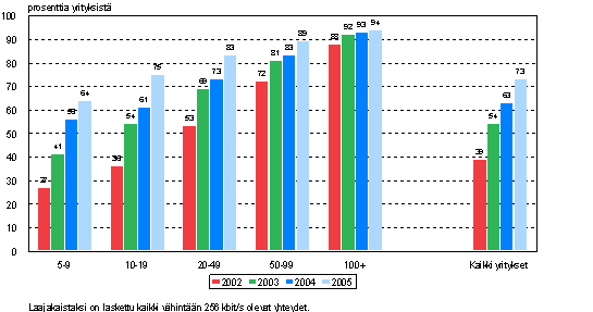 Keväällä 2005 laajakaistayhteys oli 73 prosentilla vähintään viisi henkilöä työllistävistä yrityksistä, kun vuotta aiemmin laajakaista oli 63 prosentilla yrityksistä. Laajakaista on yleistynyt nopeasti kaiken kokoisissa yrityksissä. Vuodesta 2002 laajakaistayhteyksien määrä on lisääntynyt kaikissa yrityksissä 34 prosenttiyksikköä ja pienissä 5-9 henkilöä työllistävissä yrityksissä 37 prosenttiyksikköä. Tiedot käyvät ilmi Tilastokeskuksen tutkimuksesta Internet ja sähköinen kauppa yrityksissä 2005. Tuoreimmat tiedot on kerätty kyselytutkimuksella keväällä 2005.