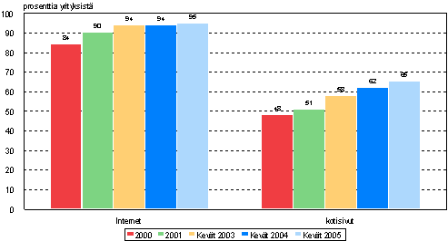 Kotisivut oli 65 prosentilla yrityksistä. Niiden yritysten määrä, joilla oli kotisivut, lisääntyi 3 prosenttiyksikköä edellisestä vuodesta. Isoilla yrityksillä oli selvästi useammin kotisivut kuin pienillä yrityksillä. Pienissä 5-9 henkilöä työllistävissä yrityksissä reilulla puolella oli kotisivut, 10-19 henkilöä työllistävissä jo 65 prosentilla, 20-49 henkilöä työllistävissä 82 prosentilla ja vähintään 50 henkilöä työllistävissä yrityksissä useammalla kuin yhdeksällä kymmenestä.