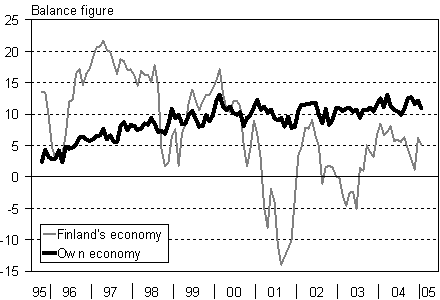 Consumers' expectations concerning their own and Finland's economy in 12 months' time 10/1995-1/2005