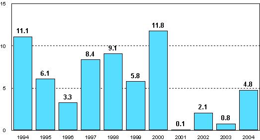 According to preliminary data published by Statistics Finland, industrial output went up by 4.8 per cent in 2004 from the year before. Industrial output returned to a path of growth last year. The exceptionally prolonged and strong period of growth in industrial output that started in the early 1990s came to a halt at the onset of the 2000s, and growth remained quite moderate over the first three years of the new millennium.