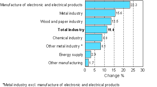 Seasonally adjusted industrial output was 11.4 per cent higher in December 2004 than in December 2003. Output went up in all main industries. The increase of output in December was largest, or as much as 23.3 per cent, in the manufacture of electronic and electrical equipment. Examined by industry, growth no longer hinged on the manufacture of electrical equipment only, but output also increased in other metal industry by 8.1 per cent, in the wood and paper industry by as much as 13.5 per cent and in the chemical industry by 8.8 per cent.