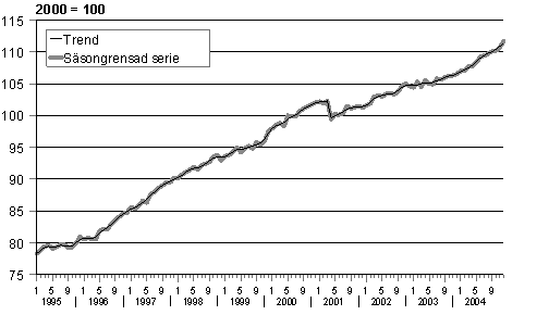 Den säsongrensade och kalenderkorrigerade (arbets- och handelsdagskorrigering) totalproduktionen uppskattas under det fjärde kvartalet år 2004 ha ökat med omkring 4,2 procent från motsvarande kvartal året innan. Granskat enligt de ursprungliga produktionsvolymerna uppskattas förändringen från motsvarande kvartal året innan vara omkring 4,3 procent. Från föregående kvartal uppskattas den säsongrensade totalproduktionen ha ökat med en procent. Kvartalsräkenskaperna och de preliminära nationalräkenskaperna med mera omfattande uppgifter om bnp utges 28.2.2005.