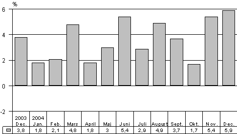 Totalproduktionen ökade med 5,9 procent från december år 2003