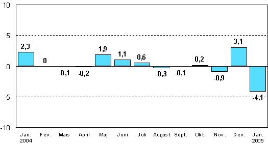Enligt Statistikcentralen var den säsongrensade industriproduktionen 4,1 procent mindre i januari år 2005 än i december 2004. Den säsongrensade produktionsvolymen ökade med 1,1 procent jämfört med januari år 2004.