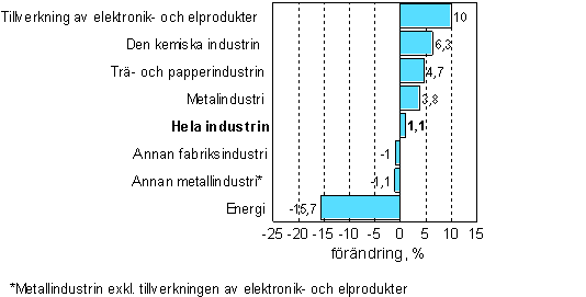 Det milda januarivädret syntes i energiförsörjningen vars produktion sjönk med 15,7 procent. Produktionen inom den övriga fabriksindustrin sjönk med en procent. Också den övriga metallindustrin sjönk med 1,1 procent.