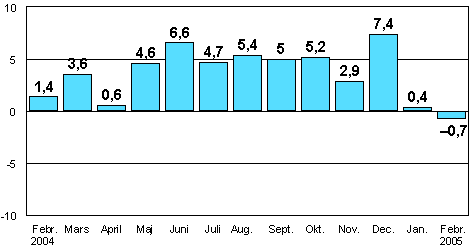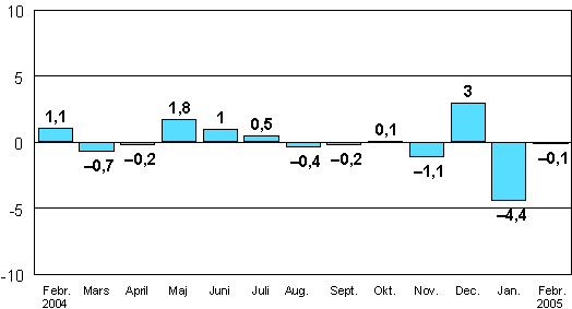 I februari 2005 var den säsongrensade industriproduktionen enligt Statistikcentralen 0,1 procent mindre än i januari. Den säsongrensade industriproduktionsvolymen sjönk med 0,7 procent från februari 2004.