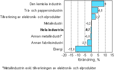 Produktionen ökade alltjämt inom flera huvudsakliga näringsgrenar. Produktionen ökade i februari mest inom den kemiska industrin, dvs. med 9,0 procent. Produktionen inom trä- och pappersindustrin ökade med 4,5 procent. Tillverkningen av elektronik- och elprodukter ökade med 2,7 procent. Produktionen sjönk fortsättningsvis mest inom energiförsörjningen, med 11,8 procent. Produktionen inom den övriga fabriksindustrin sjönk med 3,1 procent.