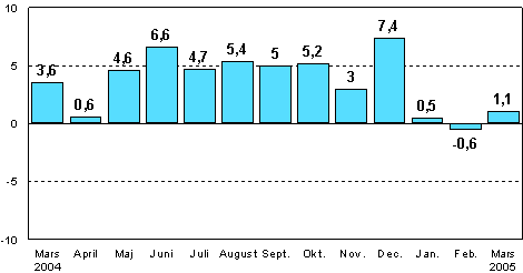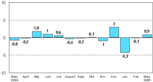 I mars 2005 var den säsongrensade industriproduktionen enligt Statistikcentralen 0,9 procent större än i februari. Den säsongrensade industriproduktionen ökade med 1,1 procent från mars 2004.