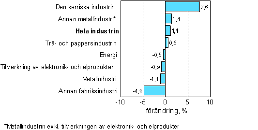 Produktionsförändringen var tudelad i mars. Bland de huvudsakliga näringsgrenarna ökade den kemiska industrin, annan metallindustri och trä- och pappersindustrin. Produktionen ökade i mars mest inom den kemiska industrin, dvs. 7,6 procent. Produktionen inom annan metallindustri ökade med 1,4 procent. Produktionen inom trä- och pappersindustrin ökade med en knapp procent. Produktionen minskade inom tillverkning av elektronik- och elprodukter, inom annan fabriksindustri och inom energiförsörjningen. Mest sjönk produktionen inom annan fabriksindustri, med 4,8 procent. Tillverkningen av elektronik- och elprodukter minskade med en knapp procent. Energiproduktionen sjönk med en halv procent.