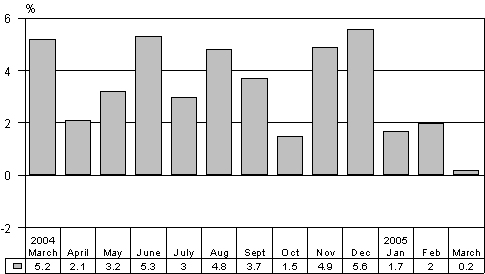 The volume of GDP rose by 0.2 per cent in March 2005 compared with the previous year's March. Of the six main industries of the Monthly Indicator manufacturing and primary production declined. In March 2005 the number of working days was two days lower than in the corresponding month of the previous year. Adjusted for working days, the volume of GDP grew by 1.9 per cent.