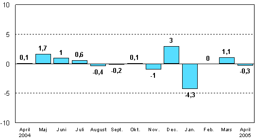 I april 2005 var den säsongrensade industriproduktionen enligt Statistikcentralen 0,3 procent mindre än i mars.