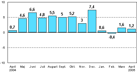 Enligt Statistikcentralen var den säsongrensade industriproduktionen 1,2 procent större i april år 2005 än i april år 2004. Den säsongrensade produktionen för januari-april ökade med under en procent jämfört med året innan.