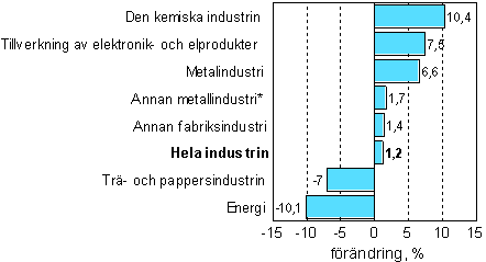 Bland de huvudsakliga näringsgrenarna stod den kemiska industrin för den största ökningen i april, dvs. 10,4 procent. Tillverkningen av elektronik och elprodukter steg med 7,5 procent. Produktionen inom metallindustrin ökade i april med 6,6 procent från året innan. Mest sjönk energiproduktionen, dvs. 10,1 procent. Produktionen inom trä- och pappersindustrin minskade i april med 7 procent jämfört med året innan.