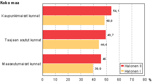 Tarja Halonen sai koko maan tasolla 5,5 prosenttiyksikköä lisä-ääniä vaalin ensimmäiseen kierrokseen verrattuna. Erot kaupunkimaisten, taajaan asuttujen ja maaseutumaisten kuntien välillä ovat suhteellisen pieniä. Kaupunkimaisissa kunnissa ja taajaan asutuissa kunnissa Halonen sai ensimmäiseen kierrokseen verrattuna lisä-ääniä keskimäärin 5,3 prosenttiyksikköä ja maaseutumaisissa kunnissa hieman enemmän eli 6,1 prosenttiyksikköä. Tulos on samankaltainen riippumatta siitä, mistä vaalipiiristä on kyse tai millainen poliittinen tausta alueella on.