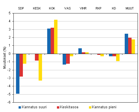 Tilastokeskuksen tekemän vaalianalyysin mukaan Kokoomuksen kannatus ei kasvanut ainoastaan Suomen Keskustan ja SDP:n vahvoilla alueilla, vaan puolue menestyi tasaisesti erilaisilla äänestysalueilla.