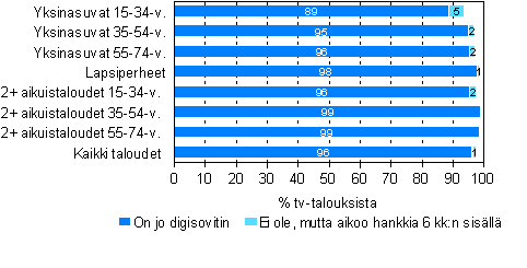 Antennin välityksellä televisiota katsovista talouksista 98 prosentilla oli toukokuussa käytössä digisovitin. Kaapelitalouksista 94 prosenttia omisti digisovittimen. Kaapelitalouksista 3 prosenttia aikoo hankkia ensimmäisen digisovittimensa viimeistään syksyllä. Tiedot perustuvat Tilastokeskuksen kuluttajabarometrin yhteydessä neljästi vuodessa tehtävään laitetiedusteluun, johon osallistui 2.-19. toukokuuta 1 473 kotitaloutta.