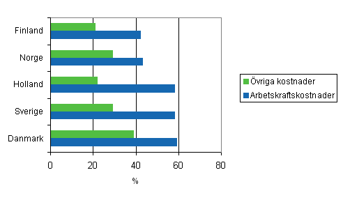 Närmare 60 procent av företagen i Danmark, Sverige och Holland ansåg att arbetskraftskostnaderna var en mycket viktig orsak till att överföra verksamheter till utlandet. I Finland ansåg något färre, dvs. 42 procent av företagen att arbetskraftskostnaderna var en central orsak till utläggning av verksamheter.