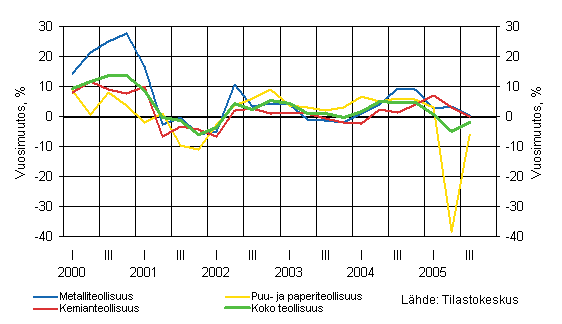 Teollisuuden suhdannetilanne oli vuoden 2005 kolmannella vuosineljänneksellä parempi kuin toisella neljänneksellä, jolloin paperiteollisuuden työkiista hidasti kasvua. Teollisuustuotannon määrän kehitys pysyi kuitenkin yhä vaatimattomana, vaikka vienti, liikevaihto ja palkkasumma kasvoivat. Liikevaihdon kasvua tuki osittain tuottajahintojen nousu ja palkkasumman suurenemista selittävät osaltaan syyskuussa maksetut tulospalkkiot. Suhdannebarometrin mukaan valtaosa teollisuusyrityksistä uskoi suhdannetilanteen pysyvän loppuvuonna ennallaan.
