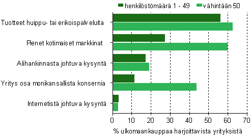 Moni yritys piti tuotteidensa erityislaatuisuutta syynä ulkomaankaupan harjoittamiseen. Yli 50 henkilön yrityksillä myös etenkin kotimaisten markkinoiden pienuus osoittautui yleiseksi ulkomaankaupan syyksi. Lakiasiain palvelun toimialalla 44 % ulkomaankauppaa harjoittavista yrityksistä piti ulkomaankaupan syynä alihankinnasta johtuvaa kysyntää. Laskentatoimen ja kirjanpidon ulkomaankauppaa käyvistä yrityksistä puolestaan 49 % ilmoitti ulkomaankaupan syyksi kotimaisten markkinoiden pienuuden. Muilla toimialoilla, mainospalvelua lukuun ottamatta, tuotteiden erityislaatuisuus oli yleisin ulkomaankaupan syy.