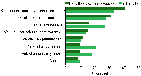 Monet sekä ulkomaankauppaa harjoittavat että kotimaan markkinoihin tyytyvät yritykset pitivät kaupallisen aseman vakiinnuttamista ja asiakkaiden tunnistamista melko tärkeänä tai erittäin tärkeänä ulkomaankaupan esteenä. Ulkomaankauppaa jo käyvien yritysten joukossa kieli- ja kulttuuriesteitä sekä henkilökunnan siirtymistä ei koettu yhtä merkittäväksi esteeksi kuin niiden yritysten joukossa, jotka eivät harjoittaneet ulkomaankauppaa.