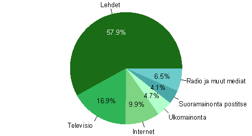 Mainospalveluiden toimialalle kuuluvien yritysten saamasta palvelunimikkeiden "mediatoimistojen palvelut" ja "mainonnan suunnittelu- ja toteutuspalvelut" yhteisliikevaihdosta lähes 58 % tuli sanoma- ja aikakauslehdistä sekä aikakausjulkaisuista. Television osuus oli lähes 17 % ja internetin lähes 10 %. Loput 15 % liikevaihdosta tulivat ulkomainonnasta, postitse jaettavasta suoramainonnasta, radiosta ja muista medioista.