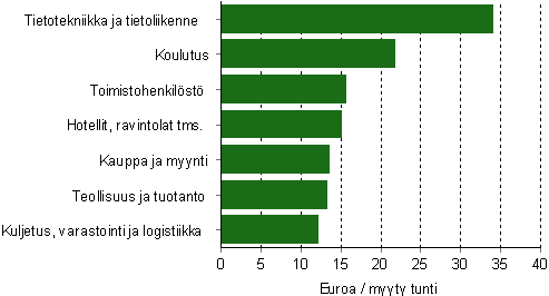 Työnvälityksen ja henkilöstön hankinnan toimialalle kuuluvat yritykset saivat työvoiman vuokrauspalveluista eniten liikevaihtoa myytyä tuntia kohden vuokratessaan henkilöstöä tietotekniikkaan ja tietoliikenteeseen liittyvään työhön. Toiseksi eniten liikevaihtoa myytyä tuntia kohden yritykset saivat vuokratessaan henkilöstöä koulutukseen liittyviin työtehtäviin. Vähiten liikevaihtoa myytyä tuntia kohden kertyi henkilöstön vuokrauksesta kuljetukseen, varastointiin ja logistiikkaan.