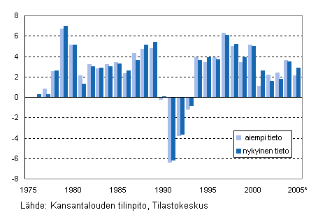 Tilastokeskus julkaisi keväällä 2006 uudistetun kansantalouden tilinpidon aikasarjan vuosilta 1975-2004. Suomen bruttokansantuote oli vuosina 1975-1993 ja 1999-2004 uusien laskelmien mukaan 1,0-2,5 prosenttia korkeampi kuin vanhoissa laskelmissa. Välivuosina 1994-1998 uusi bruttokansantuote poikkeaa vanhasta vain 0,2 prosenttia suuntaan tai toiseen.