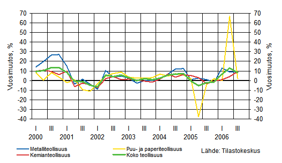 Metalliteollisuudessa tuotannon vahva kasvu jatkui kolmannella vuosineljänneksellä ja kasvua toivat kaikki alatoimialat. Puu- ja paperiteollisuudessa sekä tuotanto että tuottajahinnat olivat vajaat 2 prosenttia korkeammat kuin vuotta aiemmin. Toimialan liikevaihdon ja viennin kasvua nosti vuoden 2005 kesän tuotantoseisokista johtunut hiljaisempi heinäkuun myynti. Myös kemianteollisuudessa kasvulukuja kohotti jonkin verran vertailuvuoden matala taso, johon vaikutti öljyjalostamon huoltoseisokki.