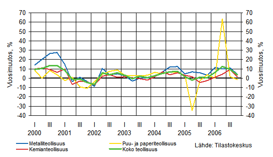 Metalliteollisuudessa teollisuustuotannon koko alkuvuoden jatkunut vahva kasvu hidastui vuoden lopussa. Liikevaihdossa kasvu jatkui myös loppuvuonna vahvana. Puu- ja paperiteollisuudessa tuotanto laski vajaat 2 prosenttia viime vuoden viimeisellä neljänneksellä. Sen sijaan liikevaihto ja tuottajahinnat jatkoivat kasvuaan. Toimialan liikevaihdon ja viennin kasvuun eivät enää vaikuttaneet vuoden 2005 kesän tuotantoseisokit. Erityisen voimakasta liikevaihdon ja hintojen kasvu oli metallien jalostuksessa. Kemianteollisuudessa sekä liikevaihdon että tuotannon kasvuvauhdit hidastuivat loppuvuonna.