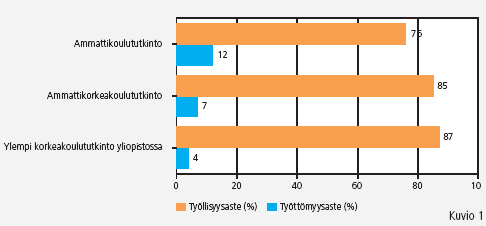 Ammattikorkeakoulututkinnon suorittaneet ovat työllistyneet erittäin hyvin: 85 prosenttia heistä oli ansiotyössä vuonna 2004. Työllisten osuus oli lähes samalla tasolla kuin ylemmän korkeakoulututkinnon (esimerkiksi maisterin, diplomi-insinöörin, oikeustieteen kandidaatin) suorittaneilla. Ammattikorkeakoulututkinnon suorittaneiden työttömyysaste (7 %) oli kuitenkin kolme prosenttiyksikköä suurempi kuin ylemmän korkeakoulututkinnon suorittaneilla. Keskiasteen ammatillisessa koulutuksessa tutkinnon suorittaneiden työllistyminen oli selvästi heikompaa kuin ammattikorkeakoulututkinnon suorittaneiden (kuvio 1).