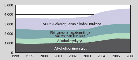 Kaikkiaan päihtyneenä tapaturmiin ja väkivaltaan kuoli viime vuonna tuhat ihmistä, kuten aiempinakin vuosina. Rajussa nousussa on ollut menehtyminen pitkäaikaisesta juomisesta johtuviin sairauksiin, samoin kuin muut kuolemat, joissa alkoholiperäinen syy tai päihtymys on myötävaikuttanut.