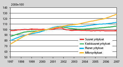 Erikokoisten yritysten liikevaihdon suhdannekehitys alkoi eriytyä 2000-luvulla, mikä näkyi erityisesti teollisuuden ja palveluiden toimialoilla. Palvelualojen pk-yritykset kasvattivat vuosina 2001-2006 liikevaihtoaan keskimäärin 8,3 prosenttia, kun suurten yritysten vastaava kasvu oli 3,5 prosenttia.